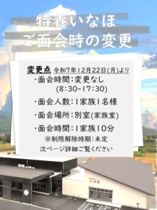 お世話になっております。特別養護老人ホームいなほの面会に関するお願いです。ご面会に関しまして変更がございますので、ご確認の上ご理解ご協力をお願い申し上げます。