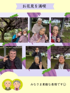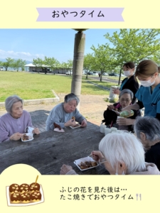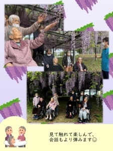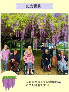福岡県田川郡福智町の特別養護老人ホームいなほでは、藤のお花見をしてきました✨ぽかぽか陽気に包まれて満開の藤のお花と、おやつのたこ焼きでとても充実した時間になりました☺️